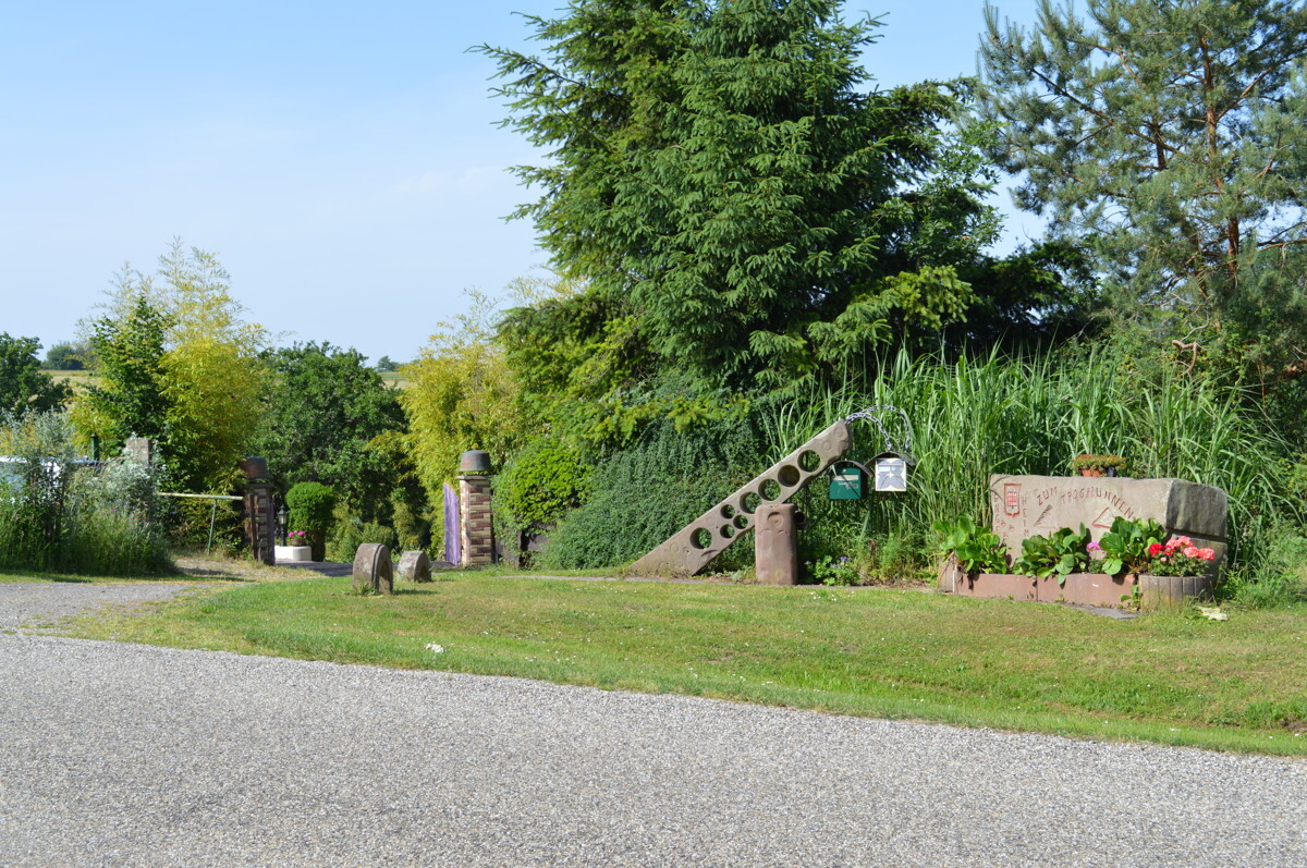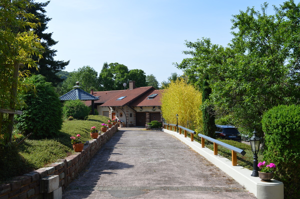 Eine lange private Zufahrt mit Sandsteinmauer und einem elektrisch gesteuerten Einfahrtstor führt direkt zum Anwesen. Trotz der ruhigen Lage ist es über eine wenig befahrene Landstraße bequem erreichbar.
