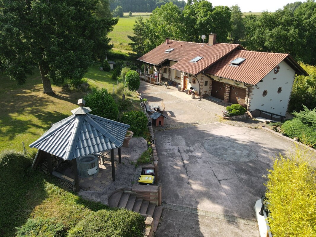 Außergewöhnliches Anwesen in Lengelsheim, Frankreich – Direkt an der deutschen GrenzeDieses außergewöhnliche Anwesen befindet sich in idyllischer Alleinlage, eingebettet in eine malerische Landschaft aus Wald, Wiesen und Feldern. Das großzügige Grundstück ist vollständig eingezäunt und bietet vielfältige Nutzungsmöglichkeiten als Weide, Garten oder Rückzugsort mit liebevoll angelegten Zierflächen. Ein romantischer Grillplatz mit Pavillon, ein Koi-Teich sowie eine gefasste Quelle unterstreichen den naturnahen und autarken Charakter der Liegenschaft.