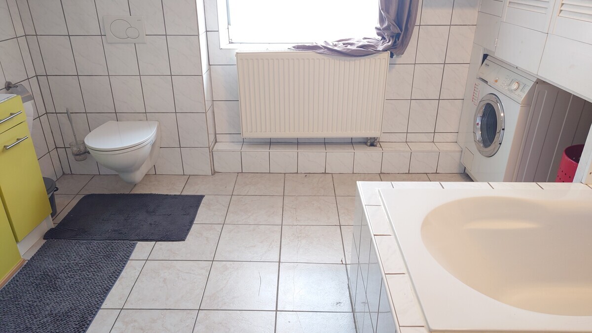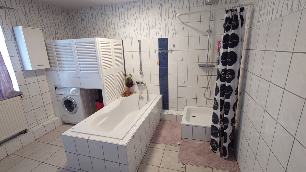 Das Badezimmer ist großzügig geschnitten und verfügt über eine Badewanne sowie eine separate Dusche.