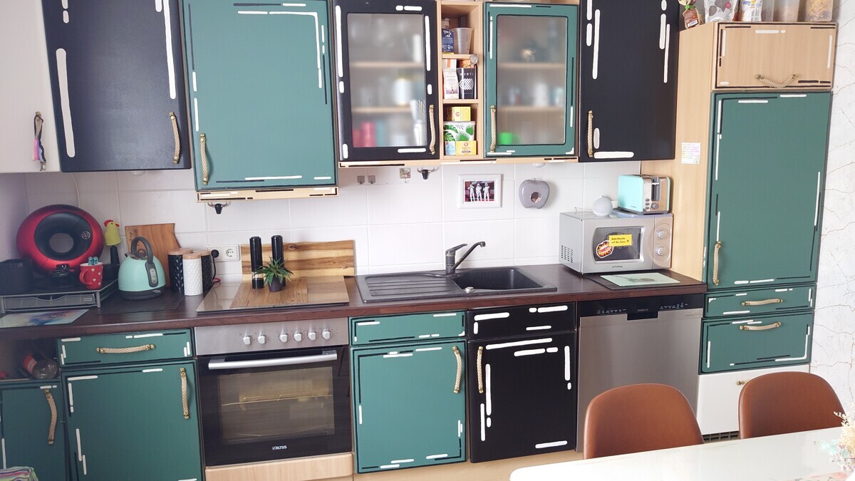 Die angrenzende Küche ist funktional ausgestattet und bietet genügend Stauraum sowie moderne Geräte.