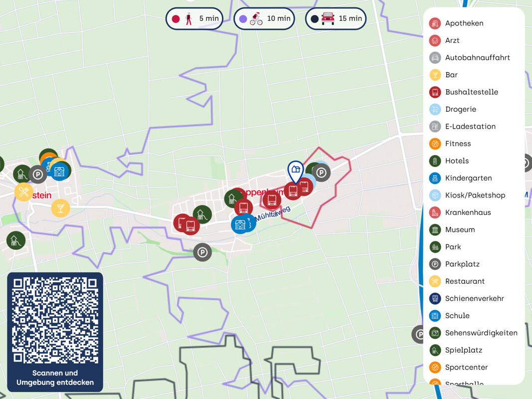 Für den täglichen Bedarf bietet ein nahegelegener Supermarkt in ca. 200 m Entfernung eine komfortable Einkaufsmöglichkeit. Familien profitieren von der Nähe zu Bildungseinrichtungen, darunter eine Grundschule in ca. 700 m und ein Kindergarten in ca. 650 m Entfernung. Die medizinische Versorgung ist durch Arztpraxen und Apotheken in einem Umkreis von ca. 3 km gesichert.