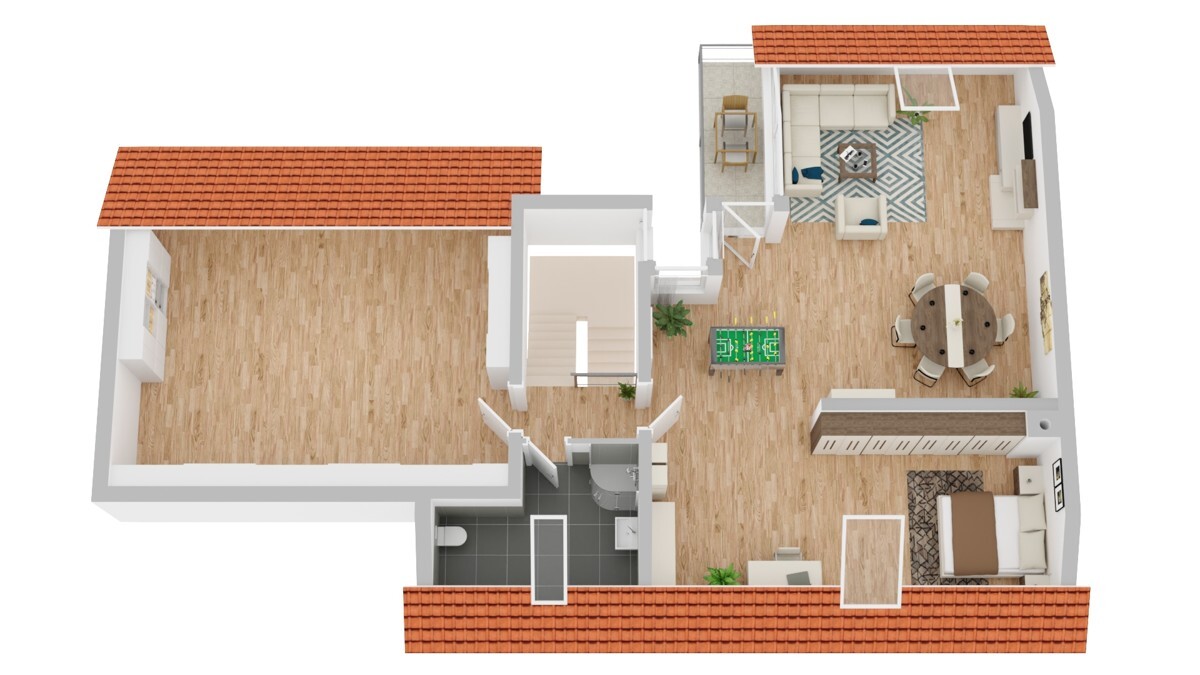 Im obersten Geschoss erwartet Sie das Highlight des Hauses: ein weitläufiges Studio mit Badezimmer und zwei separaten Zimmern sowie Zugang zu einer schönen Loggia. Dieser Bereich wurde kürzlich mit einer modernen Klimaanlage ausgestattet und eignet sich hervorragend als Rückzugsort, Atelier oder für größere Kinder.