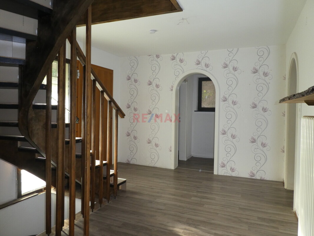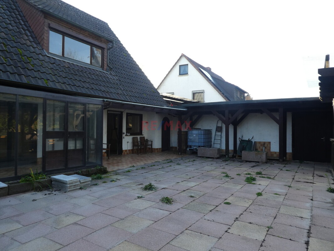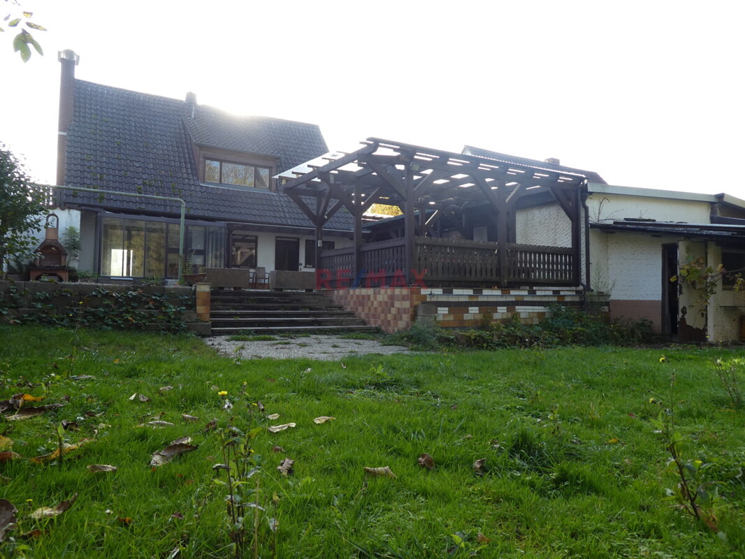 Vom Wohnzimmer im Erdgeschoss aus erreichen Sie das große Grundstück mit Terrasse, Wintergarten und mehreren Nebengebäuden.