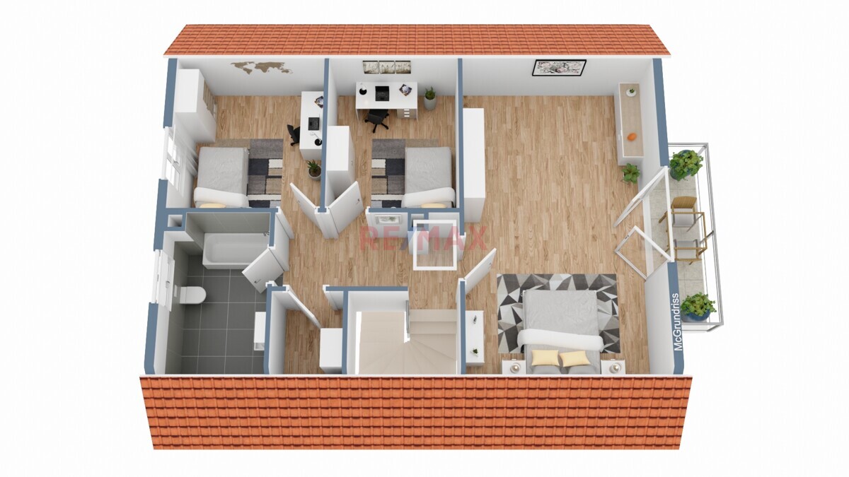 Das Dachgeschoss besteht aus drei Schlafzimmern (eines davon mit Balkon) sowie einem Tageslichtbad mit Dusche und Wanne. Im Schlafzimmer ist ein Einbauschrank verbaut.